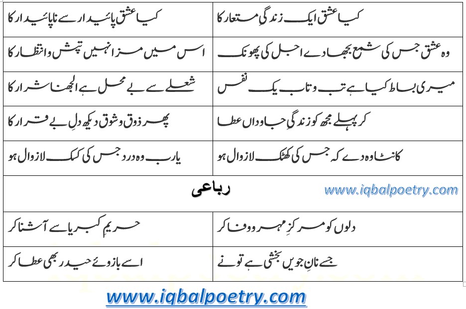 مطلب: اس رباعی میں اقبال دعائیہ لہجہ اختیار کرتے ہوئے خداوند عزوجل سے درخواست گزار ہیں کہ مولا! انسانی قلوب کو اپنی محبت سے لبریز کر دے اور انہیں راہ وفا پر گامزن کر دے